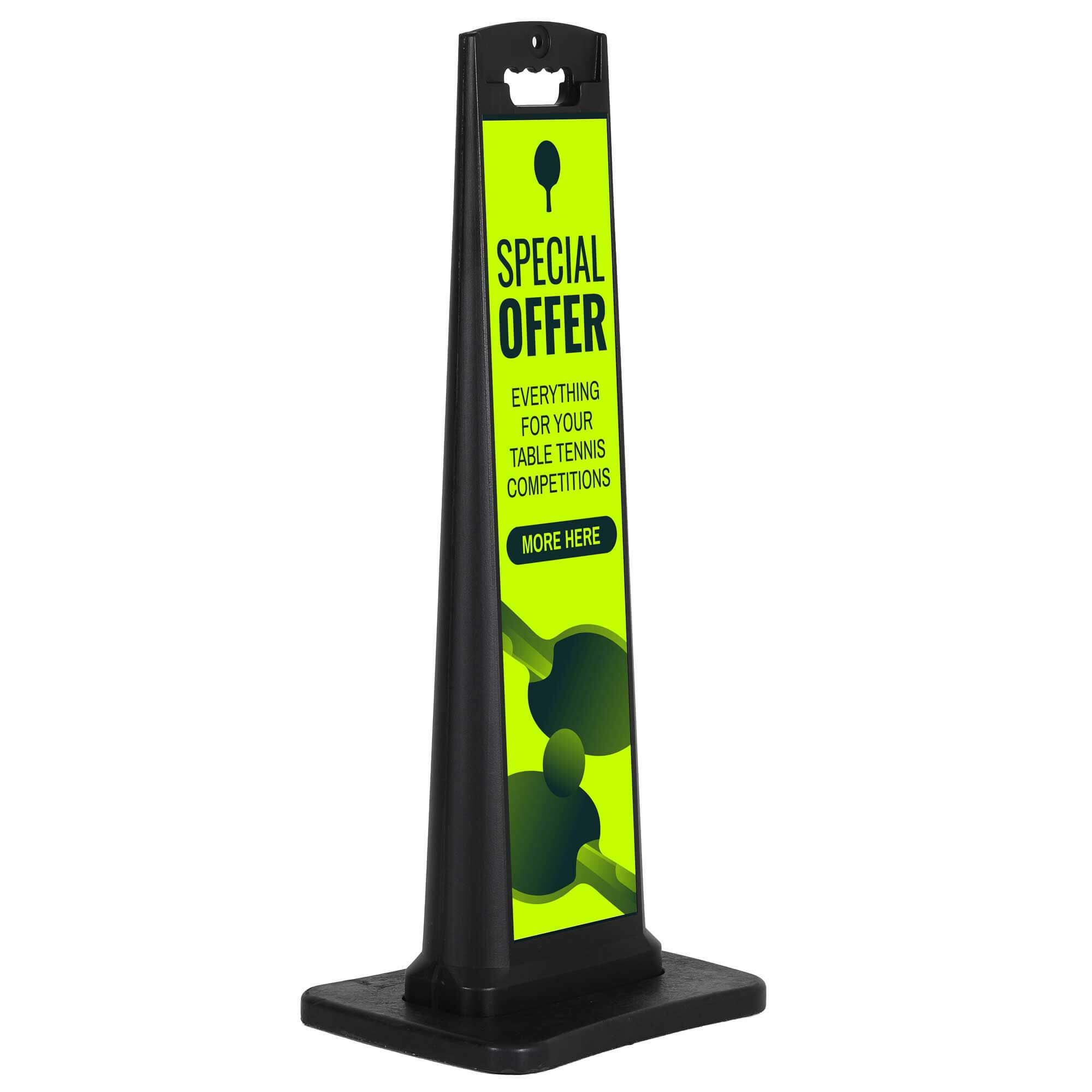 Show your prospects how you are different and better than your competitors displaying your difference on a portable A-frame sign. Why not to use a metal black a-frame sign fitting in any environment ?